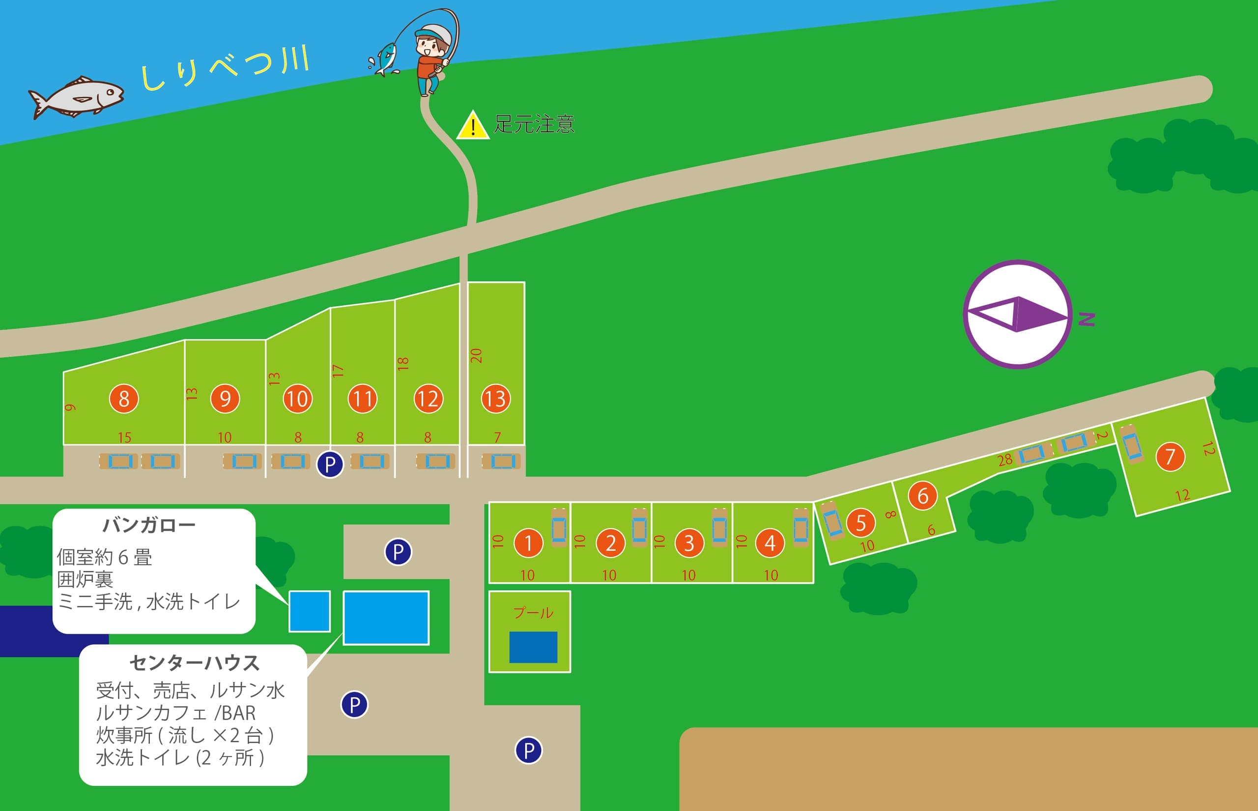 キャンプ区画・バンガローのご利用は、センターハウス受付カウンターにて受付してください。 |